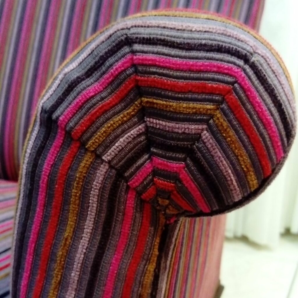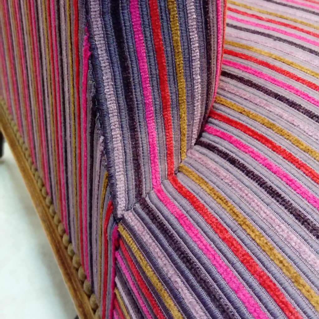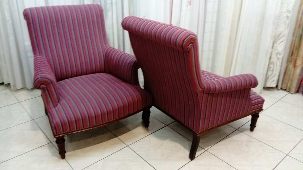 Fauteuils anglais, réfection rayée avec une attention minutieuse aux détails.