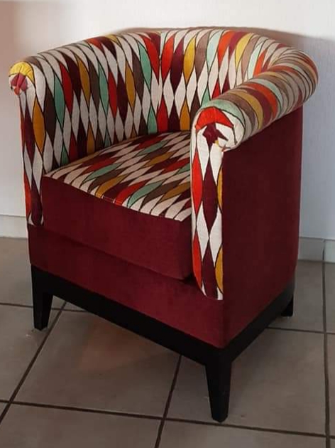 Un fauteuil tonneau arlequin.