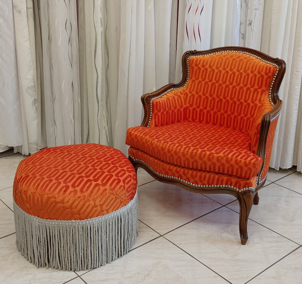Un assortiment de bergère et pouf à frange dans un bel orange texturé
